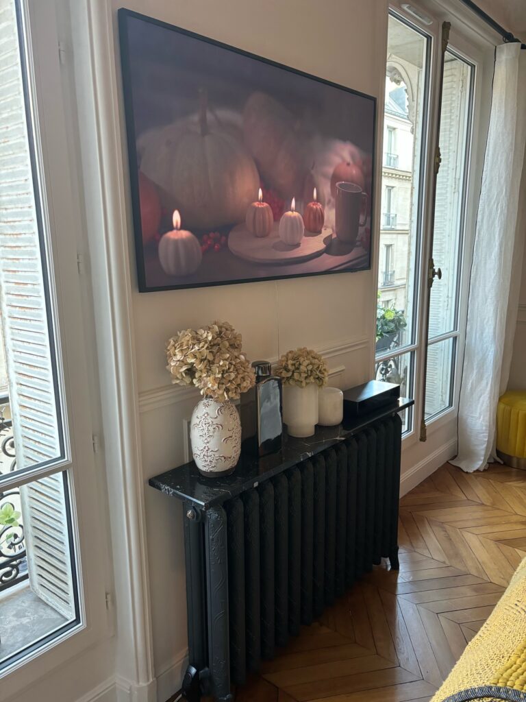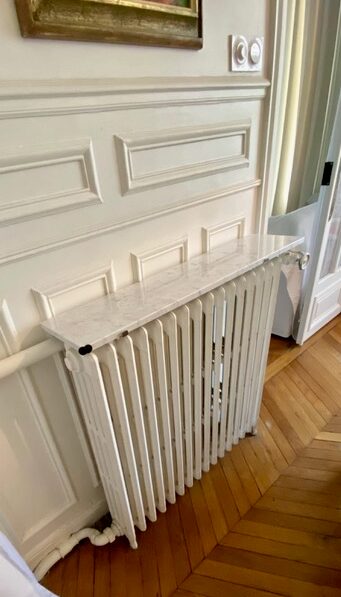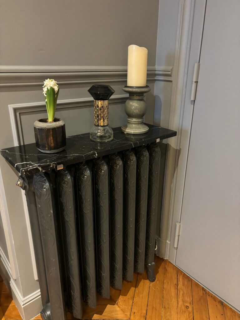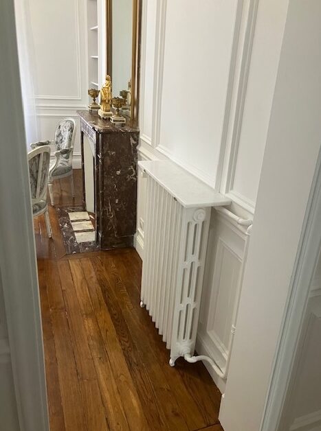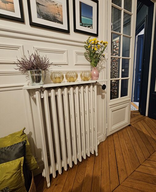 Dans les appartements haussmanniens, les maisons et demeures de caractère, le radiateur en fonte est souvent un élément structurant de l’espace, mais rarement valorisé. La transformation de cet élément fonctionnel en véritable composant décoratif illustre parfaitement la démarche de réinterprétation contemporaine.